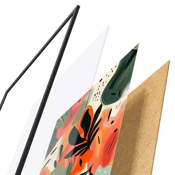 El póster consta de marco, plexiglás, imagen impresa y soporte de aglomerado. El póster puede colgarse inmediatamente en la pared gracias a los soportes de la parte posterior.