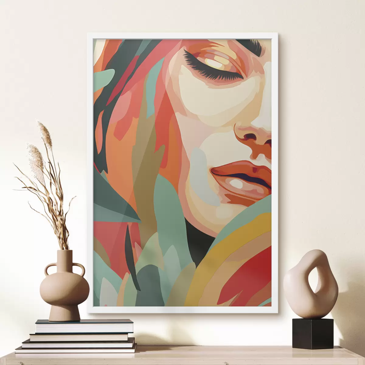 Poster Hermoso rostro de mujer, abstracción geométrica, floral, dibujo acrílico f40815