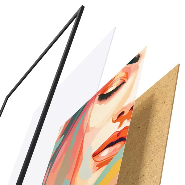 El póster consta de marco, plexiglás, imagen impresa y soporte de aglomerado. El póster puede colgarse inmediatamente en la pared gracias a los soportes de la parte posterior.