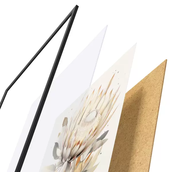 El póster consta de marco, plexiglás, imagen impresa y soporte de aglomerado. El póster puede colgarse inmediatamente en la pared gracias a los soportes de la parte posterior.
