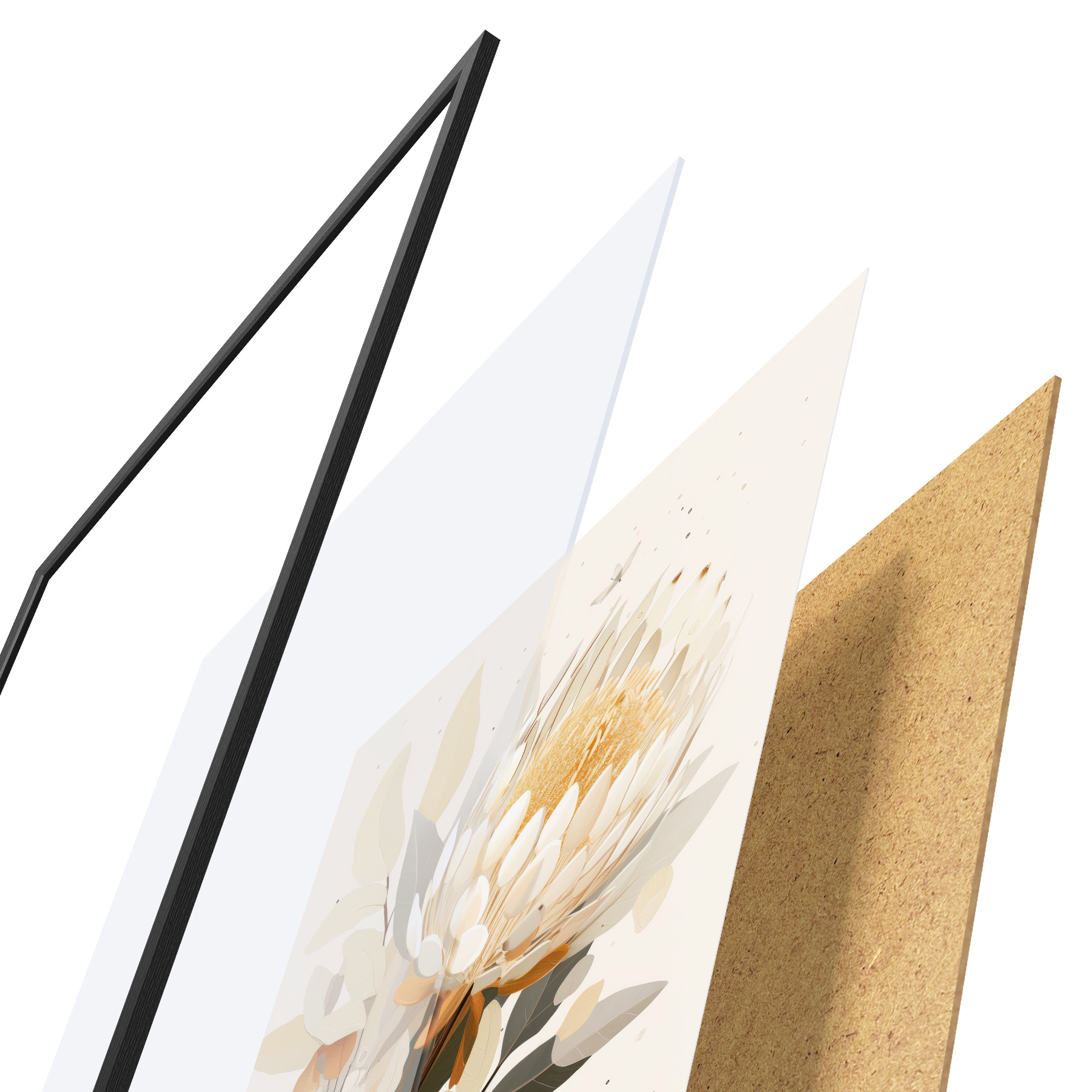 El póster consta de marco, plexiglás, imagen impresa y soporte de aglomerado. El póster puede colgarse inmediatamente en la pared gracias a los soportes de la parte posterior.