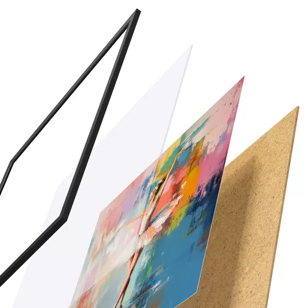 El póster consta de marco, plexiglás, imagen impresa y soporte de aglomerado. El póster puede colgarse inmediatamente en la pared gracias a los soportes de la parte posterior.