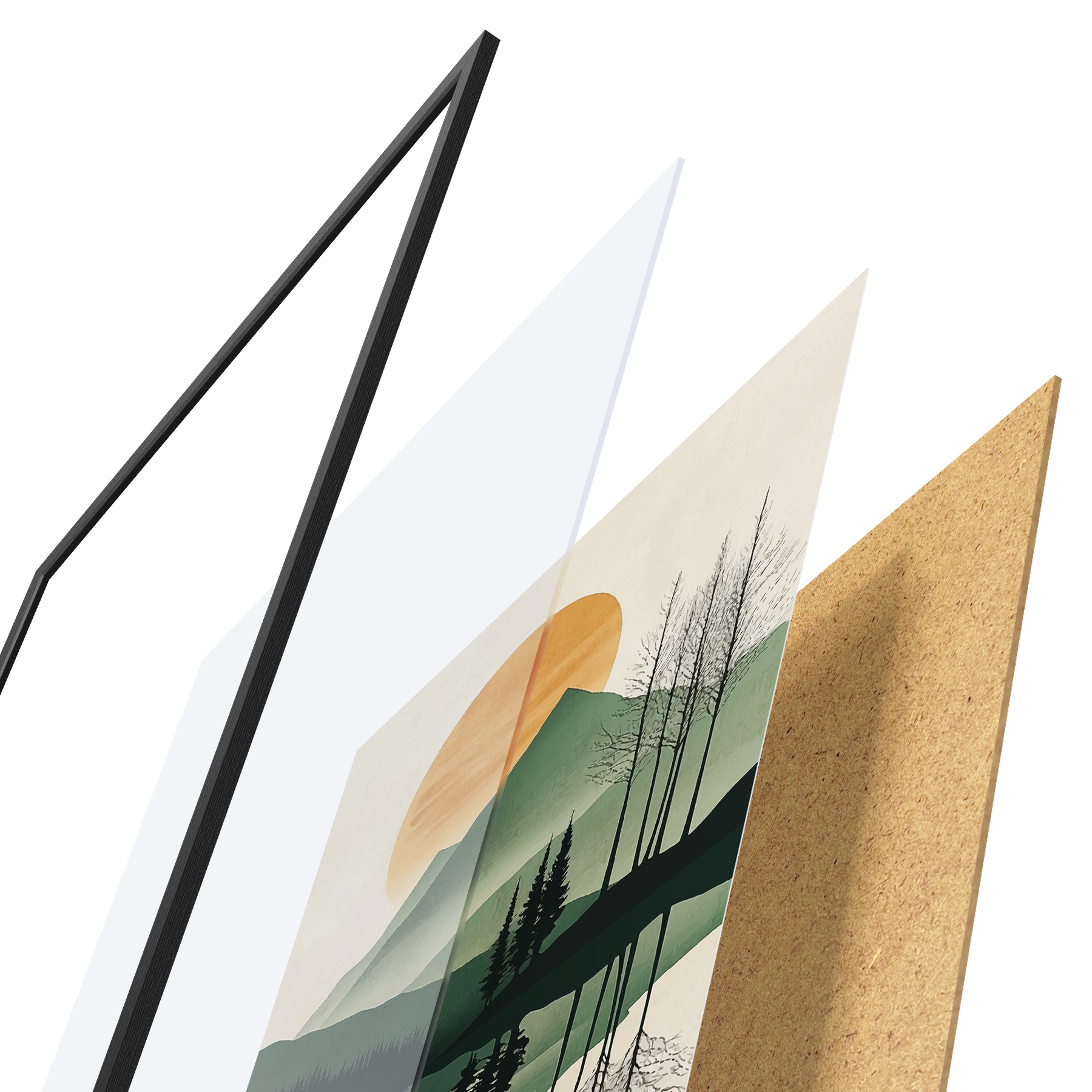 El póster consta de marco, plexiglás, imagen impresa y soporte de aglomerado. El póster puede colgarse inmediatamente en la pared gracias a los soportes de la parte posterior.
