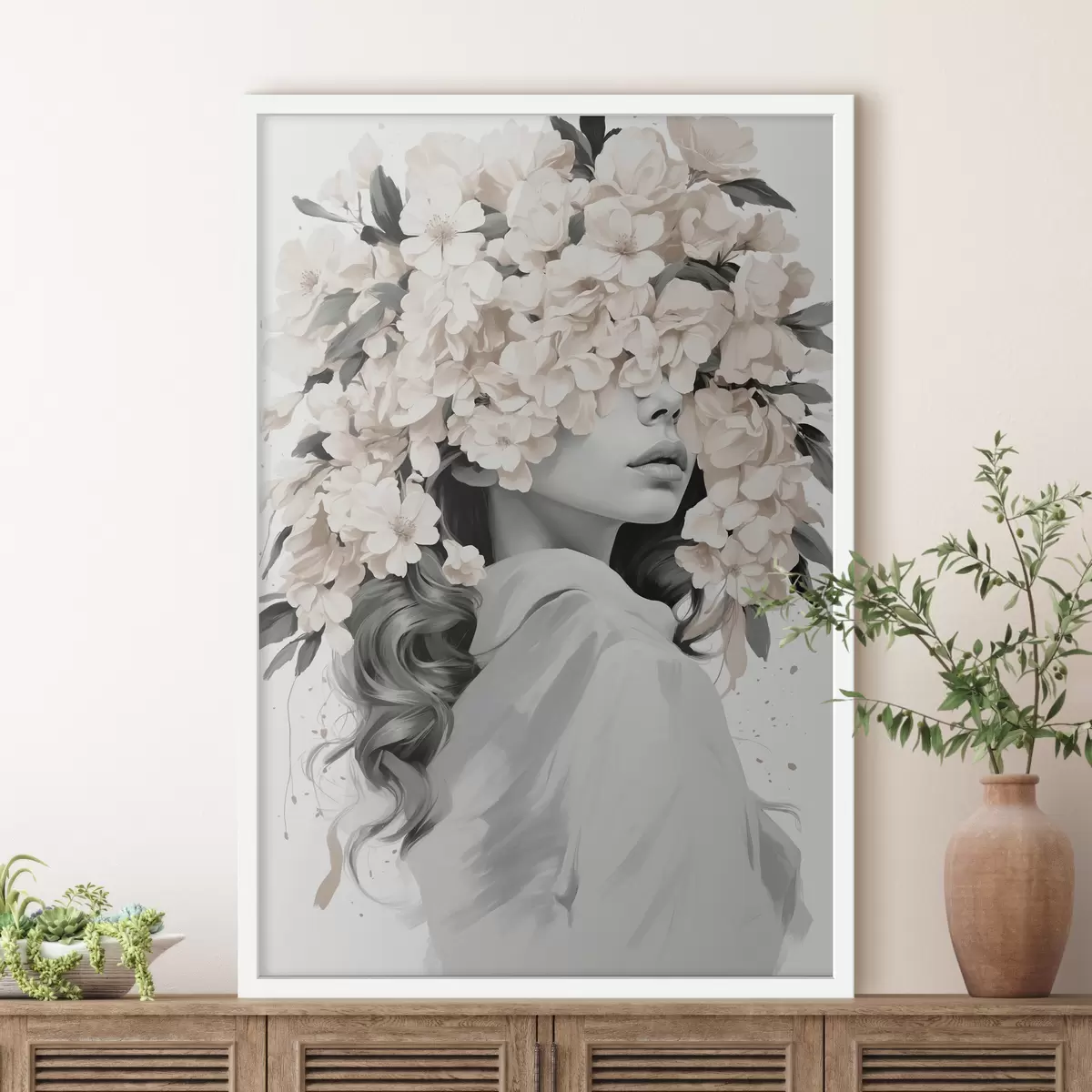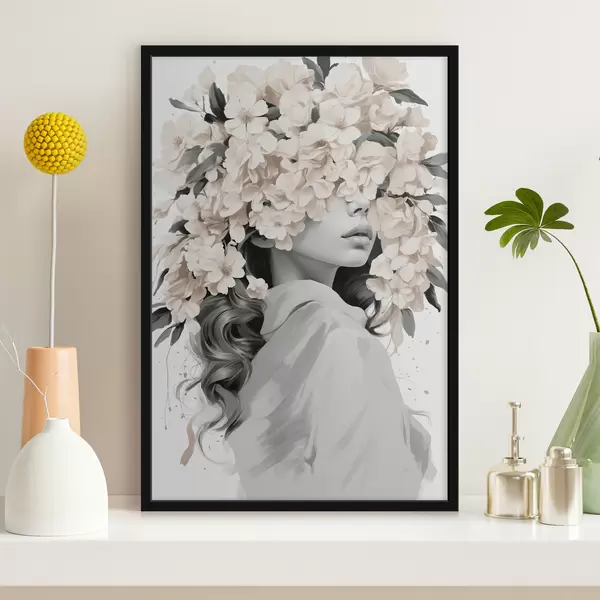 Poster Chica con flores en la cara en colores blanco y negro f40849