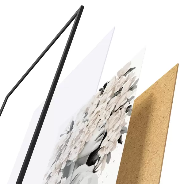 El póster consta de marco, plexiglás, imagen impresa y soporte de aglomerado. El póster puede colgarse inmediatamente en la pared gracias a los soportes de la parte posterior.