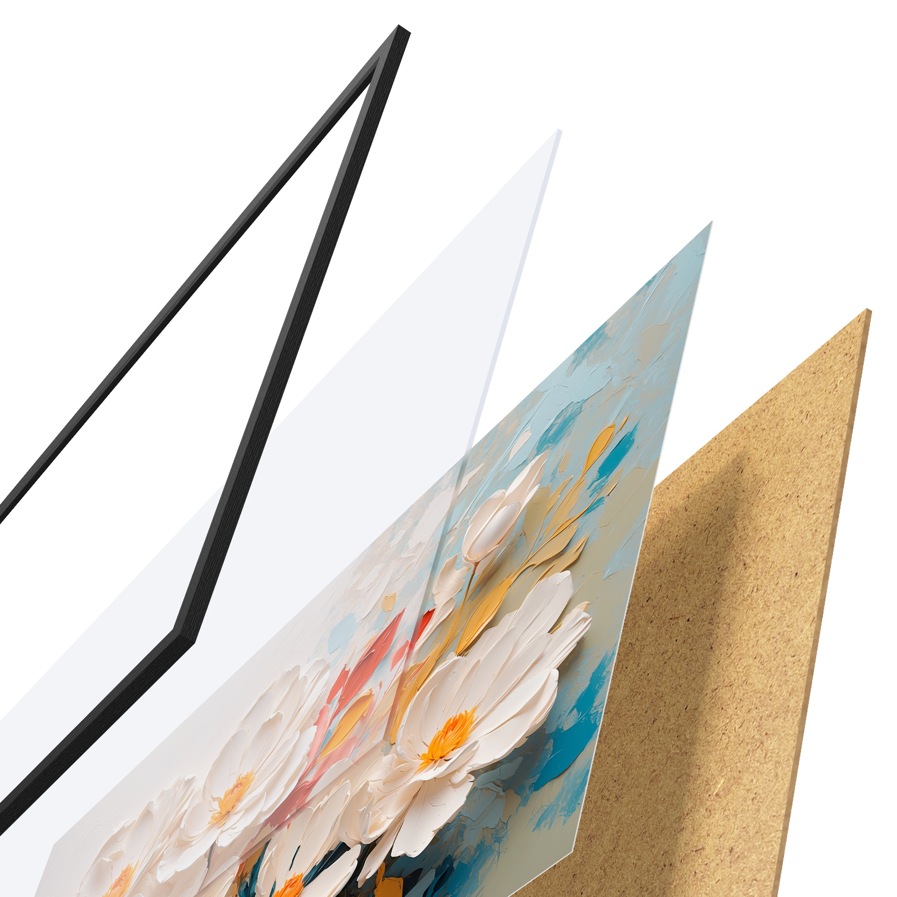 El póster consta de marco, plexiglás, imagen impresa y soporte de aglomerado. El póster puede colgarse inmediatamente en la pared gracias a los soportes de la parte posterior.