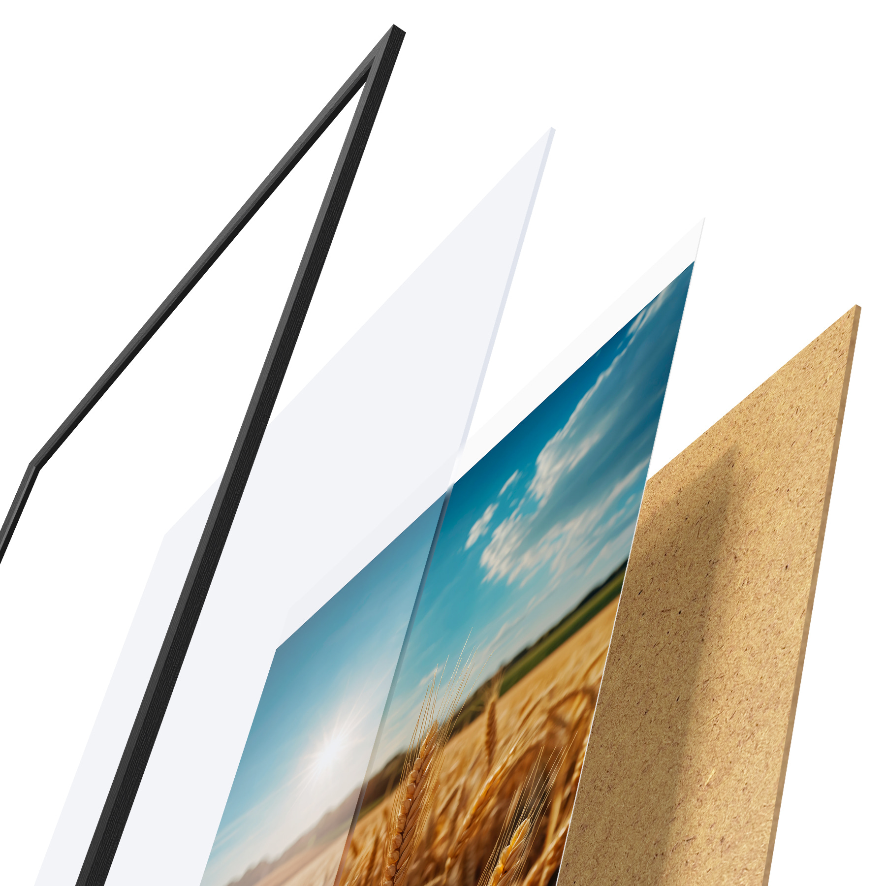 El póster consta de marco, plexiglás, imagen impresa y soporte de aglomerado. El póster puede colgarse inmediatamente en la pared gracias a los soportes de la parte posterior.
