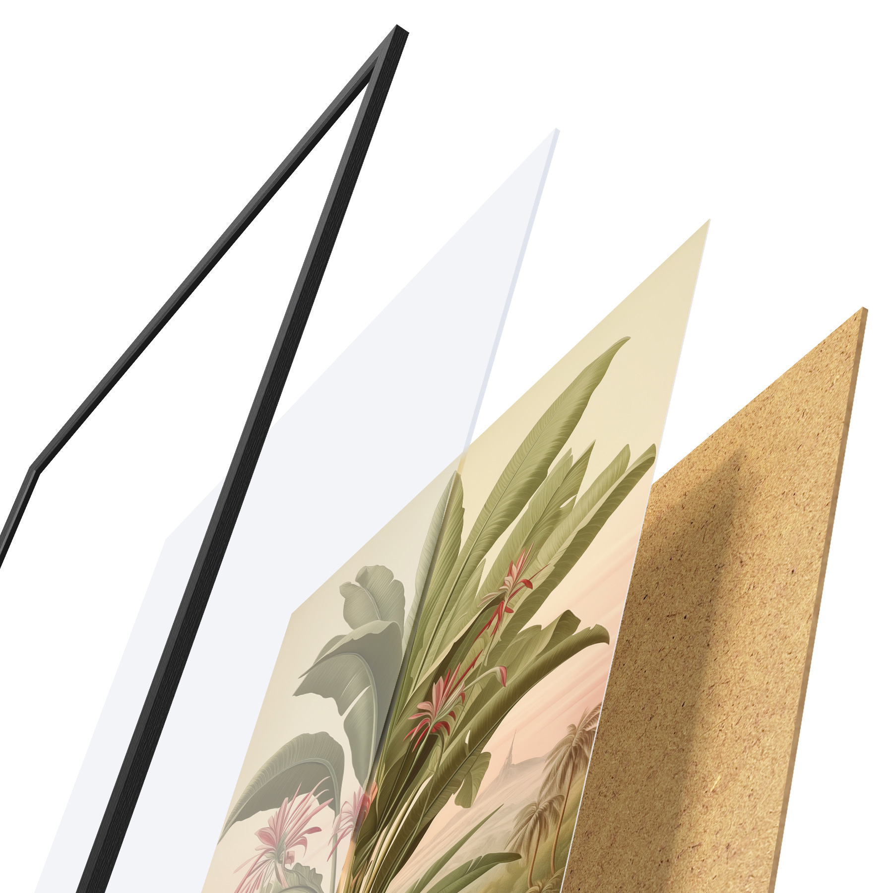 El póster consta de marco, plexiglás, imagen impresa y soporte de aglomerado. El póster puede colgarse inmediatamente en la pared gracias a los soportes de la parte posterior.