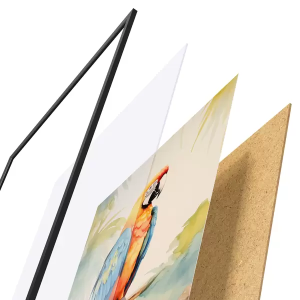 El póster consta de marco, plexiglás, imagen impresa y soporte de aglomerado. El póster puede colgarse inmediatamente en la pared gracias a los soportes de la parte posterior.