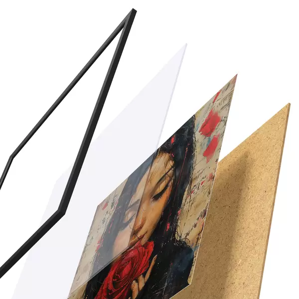 El póster consta de marco, plexiglás, imagen impresa y soporte de aglomerado. El póster puede colgarse inmediatamente en la pared gracias a los soportes de la parte posterior.