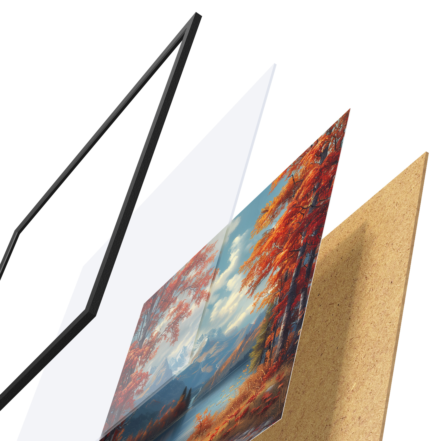 El póster consta de marco, plexiglás, imagen impresa y soporte de aglomerado. El póster puede colgarse inmediatamente en la pared gracias a los soportes de la parte posterior.