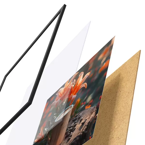 El póster consta de marco, plexiglás, imagen impresa y soporte de aglomerado. El póster puede colgarse inmediatamente en la pared gracias a los soportes de la parte posterior.