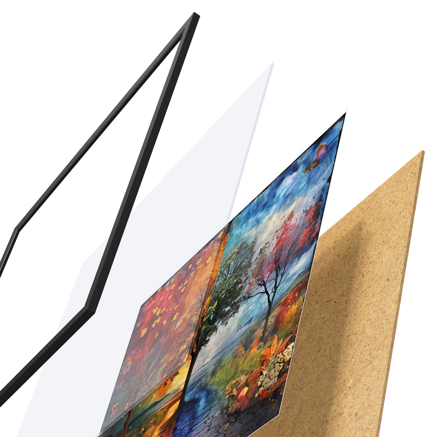 El póster consta de marco, plexiglás, imagen impresa y soporte de aglomerado. El póster puede colgarse inmediatamente en la pared gracias a los soportes de la parte posterior.