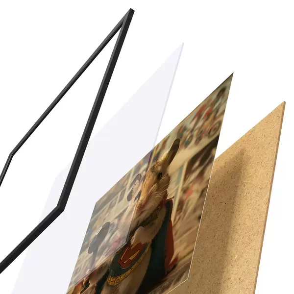El póster consta de marco, plexiglás, imagen impresa y soporte de aglomerado. El póster puede colgarse inmediatamente en la pared gracias a los soportes de la parte posterior.
