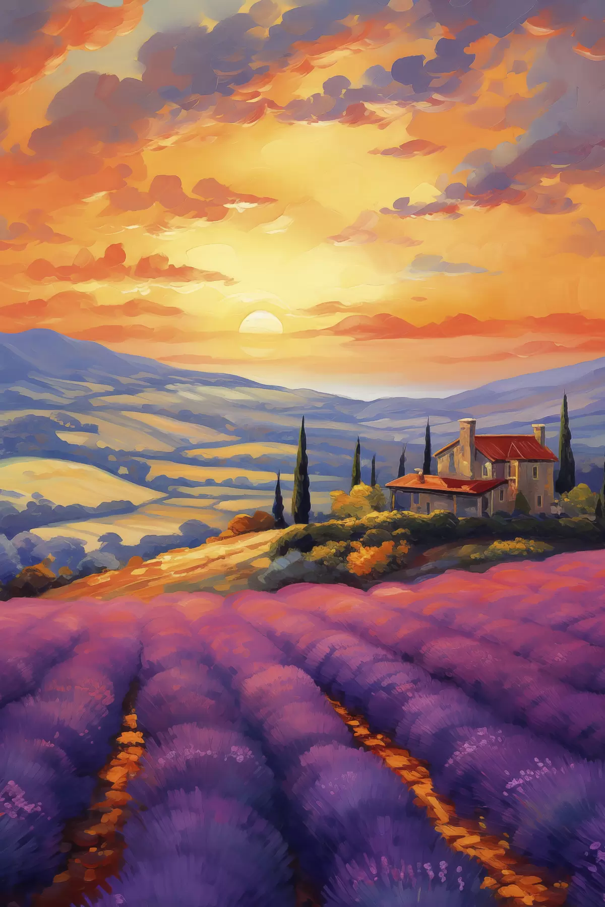 Poster Toscana puesta de sol, campos de lavanda, hermosos paisajes, acuarela f40942