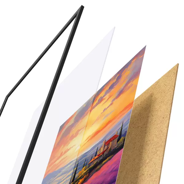 El póster consta de marco, plexiglás, imagen impresa y soporte de aglomerado. El póster puede colgarse inmediatamente en la pared gracias a los soportes de la parte posterior.