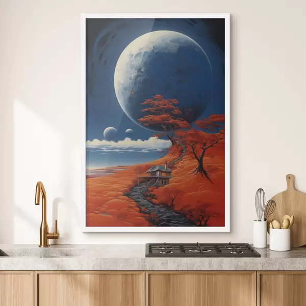 Poster Ilustración cósmica, planetas, cielo azul, casa en la colina, árboles Nr f40946