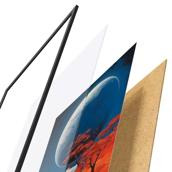 El póster consta de marco, plexiglás, imagen impresa y soporte de aglomerado. El póster puede colgarse inmediatamente en la pared gracias a los soportes de la parte posterior.