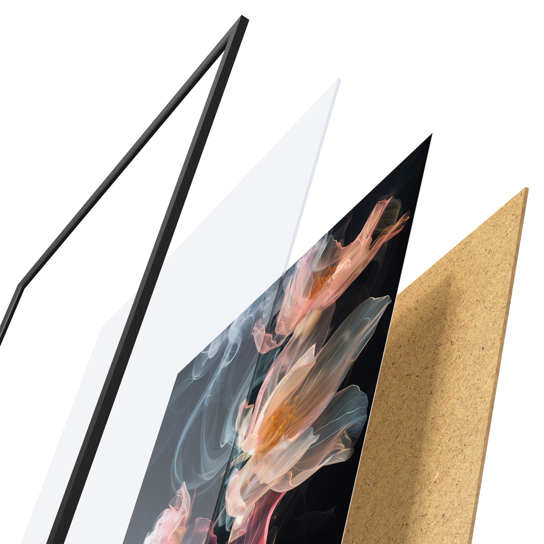 El póster consta de marco, plexiglás, imagen impresa y soporte de aglomerado. El póster puede colgarse inmediatamente en la pared gracias a los soportes de la parte posterior.
