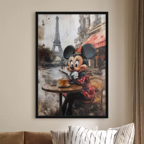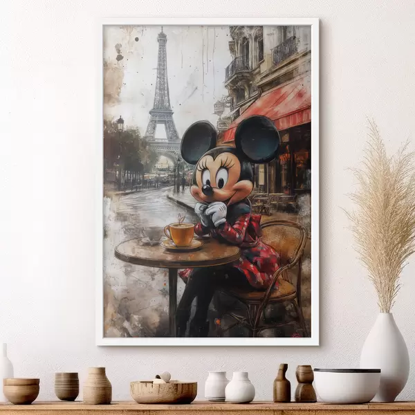 Poster Chica Mickey Mouse bebiendo café contra la Torre Eiffel en París Nr f40972