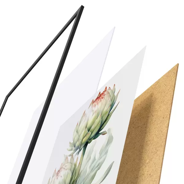 El póster consta de marco, plexiglás, imagen impresa y soporte de aglomerado. El póster puede colgarse inmediatamente en la pared gracias a los soportes de la parte posterior.
