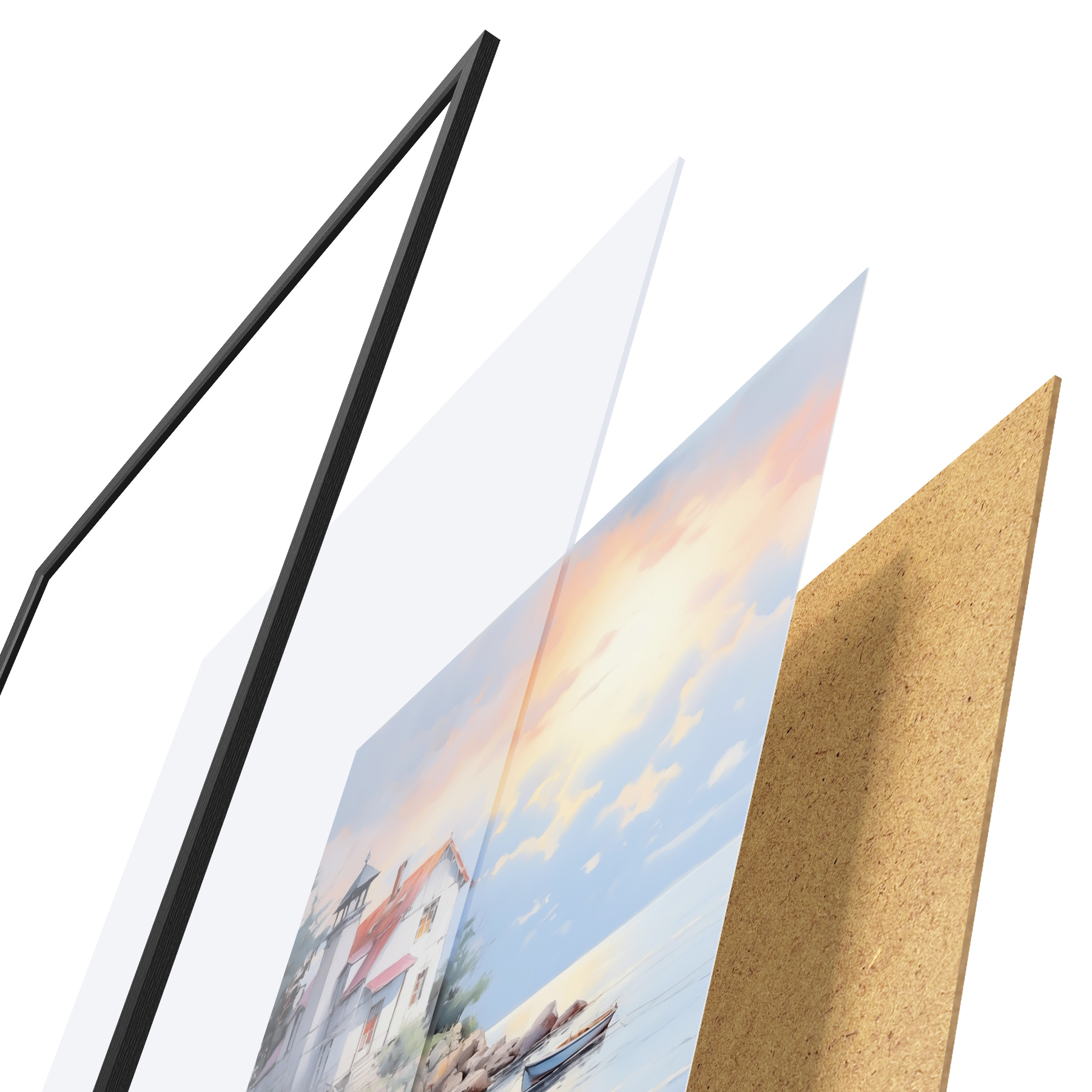 El póster consta de marco, plexiglás, imagen impresa y soporte de aglomerado. El póster puede colgarse inmediatamente en la pared gracias a los soportes de la parte posterior.