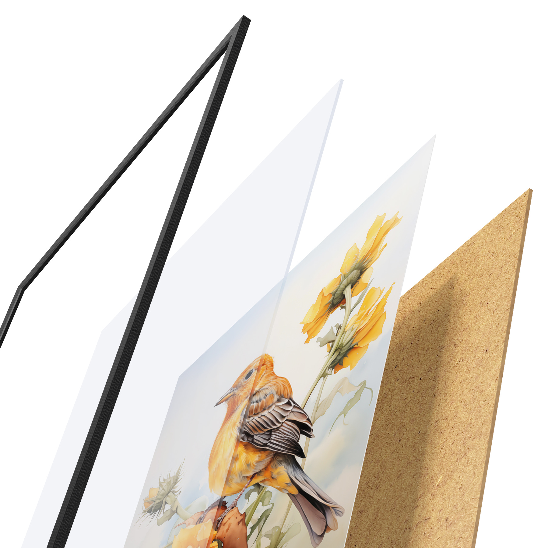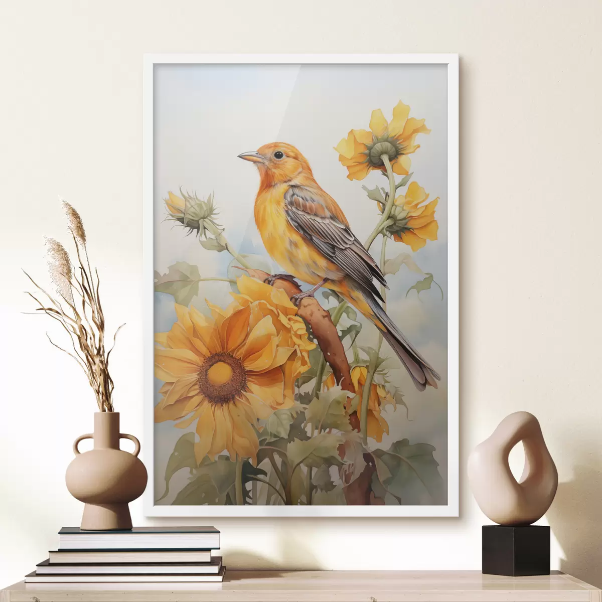 Poster Pájaro amarillo sentado en girasol acuarela Nr f41015