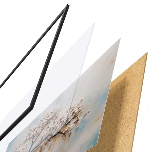 El póster consta de marco, plexiglás, imagen impresa y soporte de aglomerado. El póster puede colgarse inmediatamente en la pared gracias a los soportes de la parte posterior.