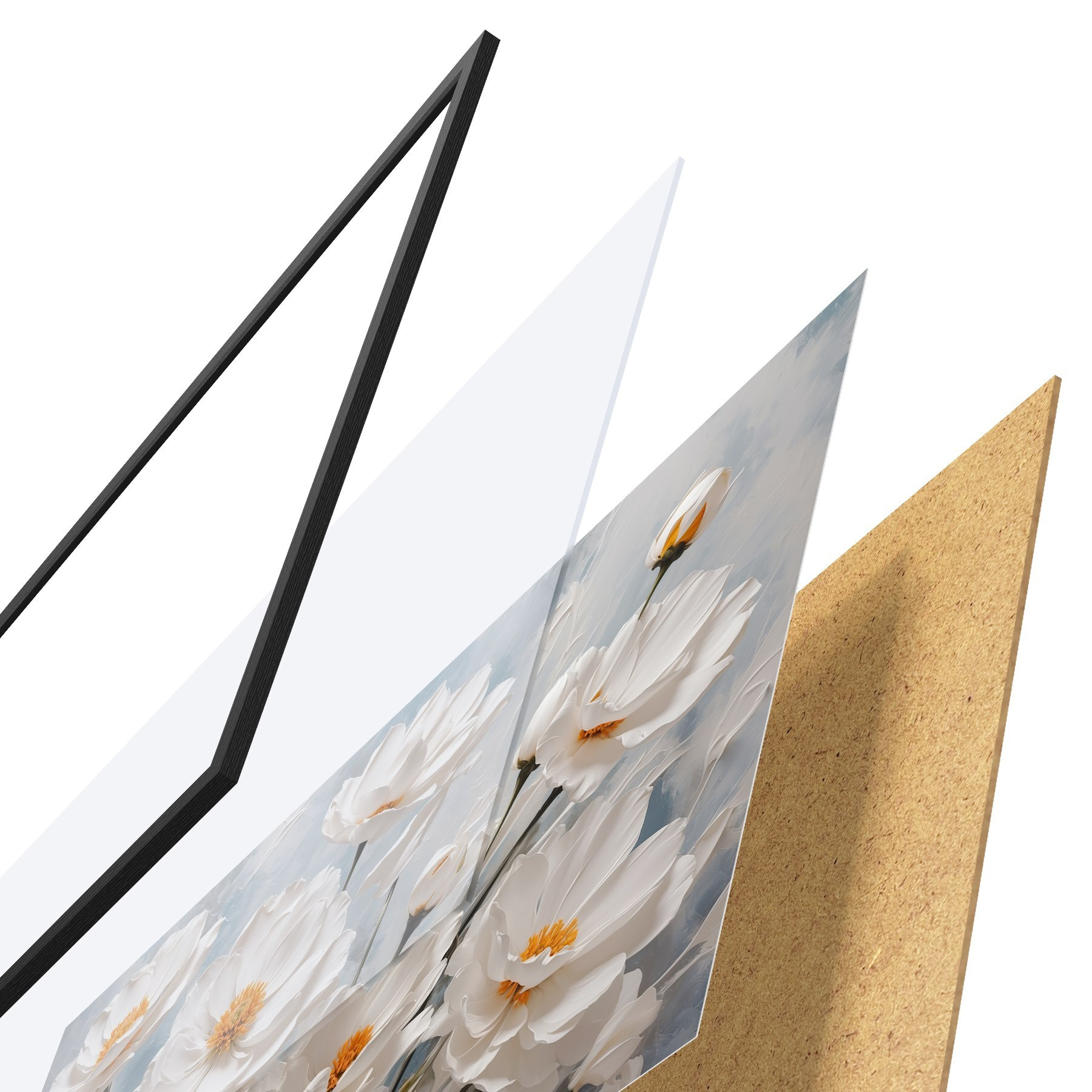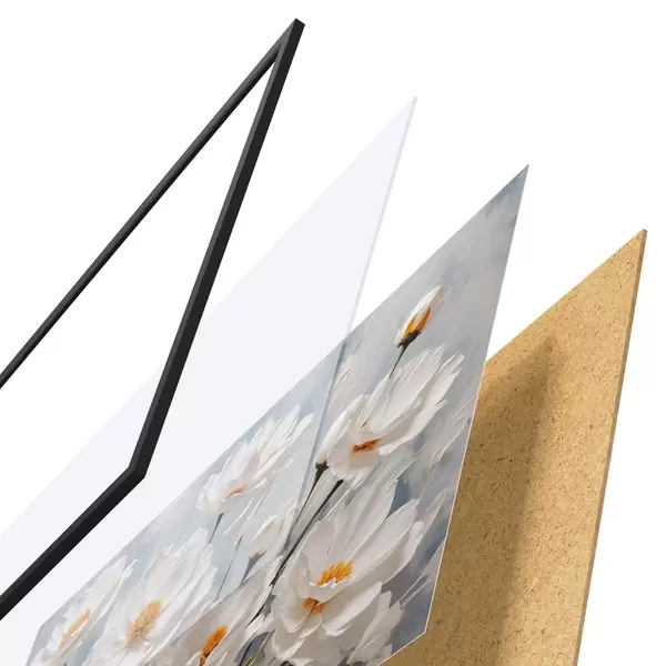 El póster consta de marco, plexiglás, imagen impresa y soporte de aglomerado. El póster puede colgarse inmediatamente en la pared gracias a los soportes de la parte posterior.