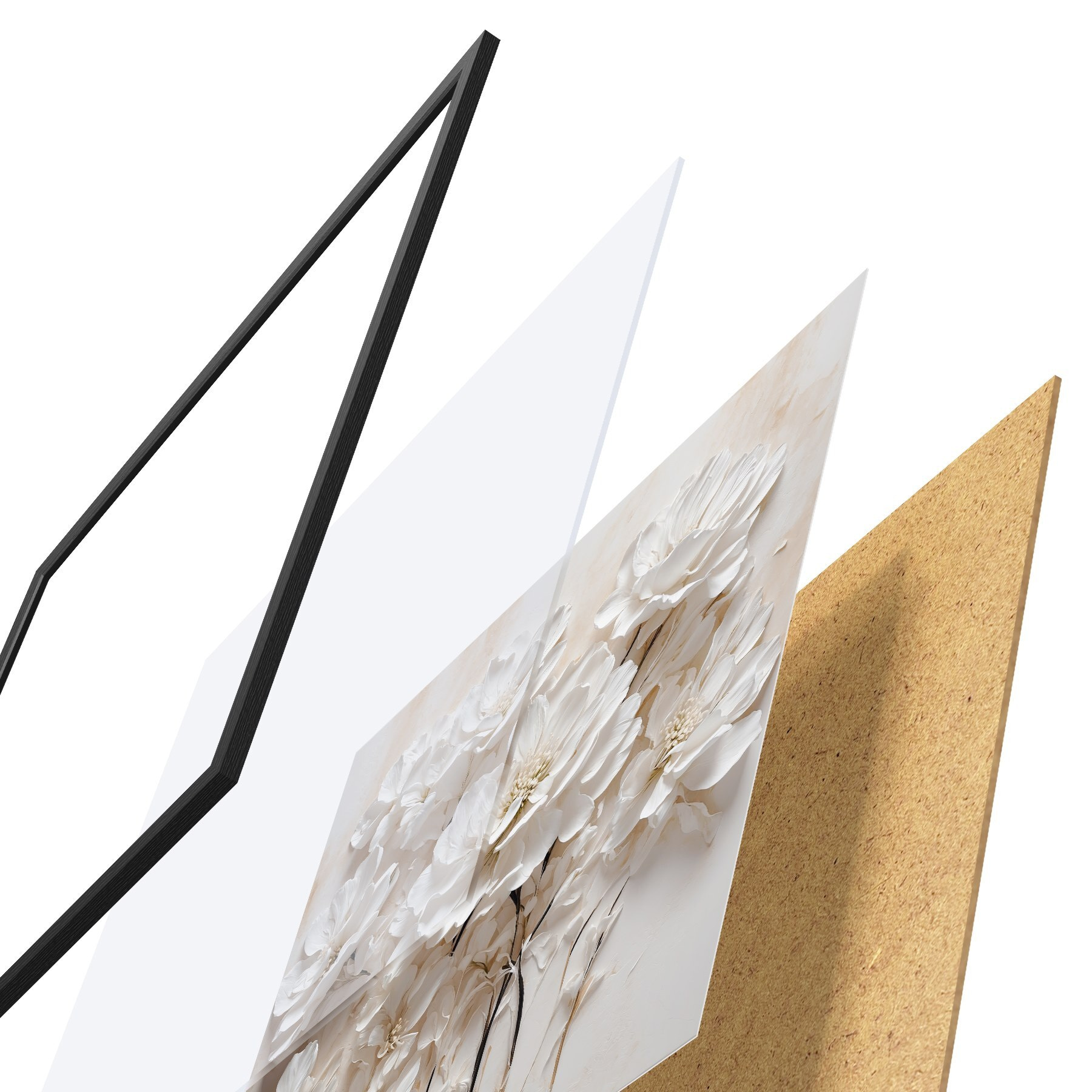 El póster consta de marco, plexiglás, imagen impresa y soporte de aglomerado. El póster puede colgarse inmediatamente en la pared gracias a los soportes de la parte posterior.