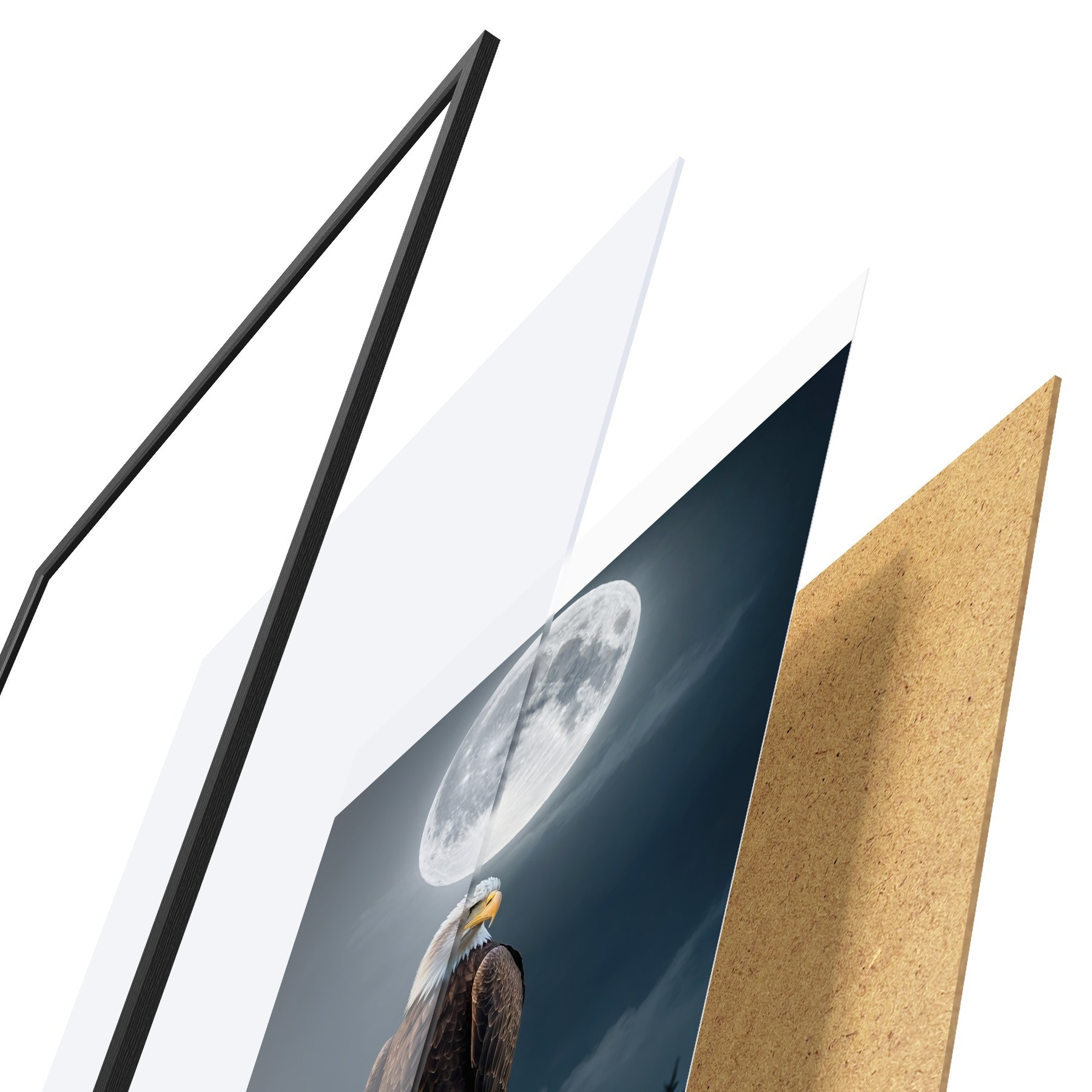 El póster consta de marco, plexiglás, imagen impresa y soporte de aglomerado. El póster puede colgarse inmediatamente en la pared gracias a los soportes de la parte posterior.