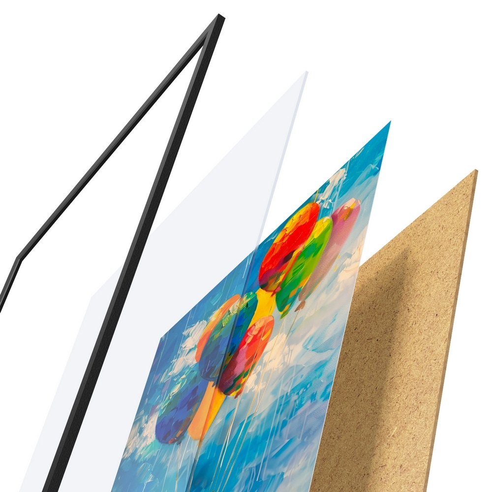 El póster consta de marco, plexiglás, imagen impresa y soporte de aglomerado. El póster puede colgarse inmediatamente en la pared gracias a los soportes de la parte posterior.