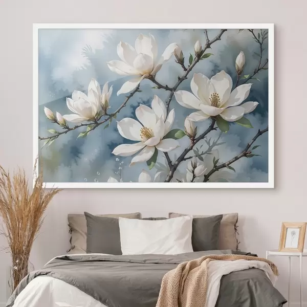 Poster Flores blancas de magnolia floreciendo en las ramas de los árboles sobre un fondo de cielo azul suave acuarela Nr f41081