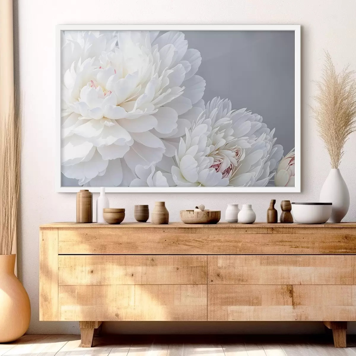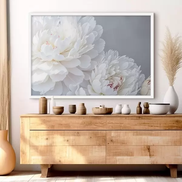 Poster Flores blancas de peonía con pétalos suaves y delicados sobre un fondo gris claro f41085