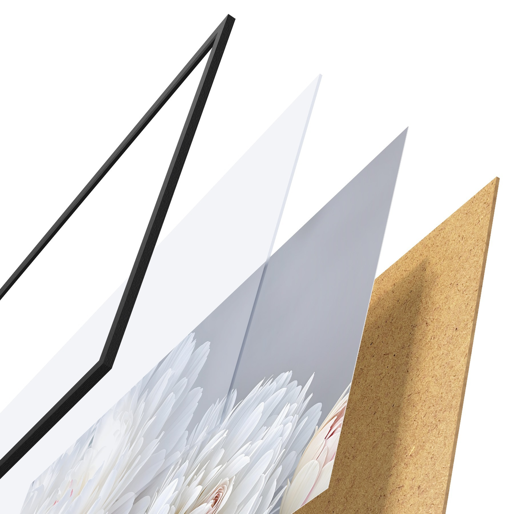 El póster consta de marco, plexiglás, imagen impresa y soporte de aglomerado. El póster puede colgarse inmediatamente en la pared gracias a los soportes de la parte posterior.