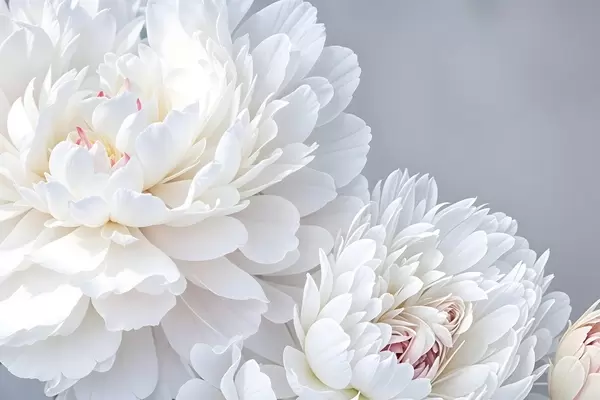 Poster Flores blancas de peonía con pétalos suaves y delicados sobre un fondo gris claro Nr f41085