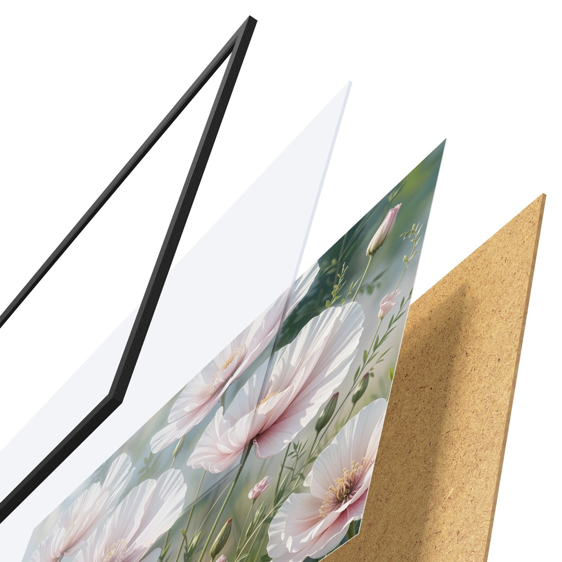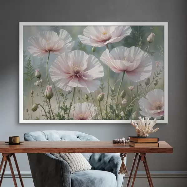 Poster Un campo de delicadas flores de amapola rosa pálido con pétalos suaves y tenues sobre un fondo verde difuminado Nr f41094