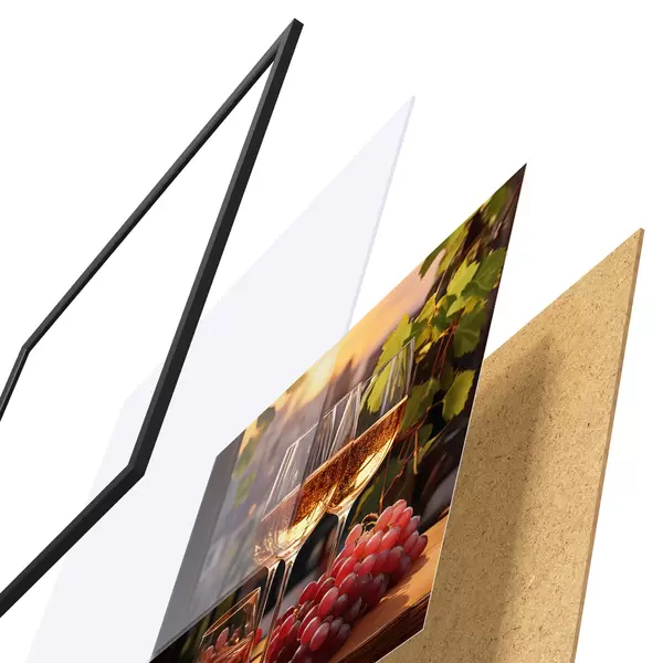 El póster consta de marco, plexiglás, imagen impresa y soporte de aglomerado. El póster puede colgarse inmediatamente en la pared gracias a los soportes de la parte posterior.