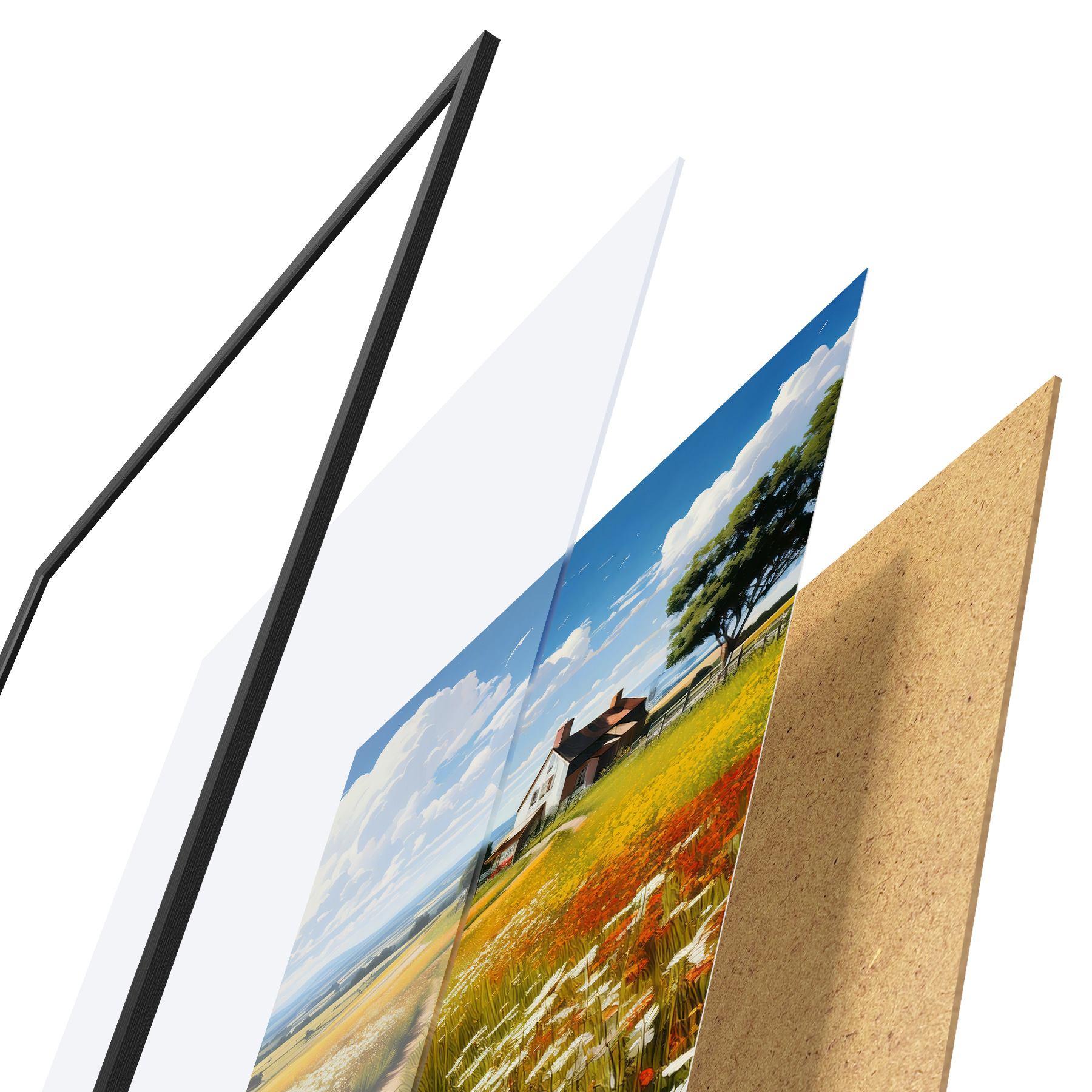 El póster consta de marco, plexiglás, imagen impresa y soporte de aglomerado. El póster puede colgarse inmediatamente en la pared gracias a los soportes de la parte posterior.