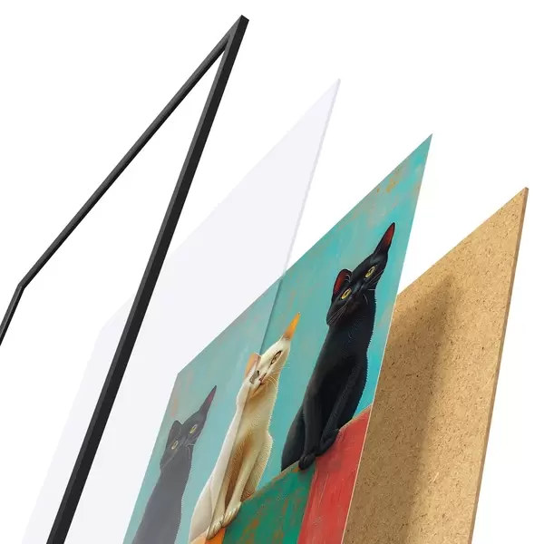 El póster consta de marco, plexiglás, imagen impresa y soporte de aglomerado. El póster puede colgarse inmediatamente en la pared gracias a los soportes de la parte posterior.