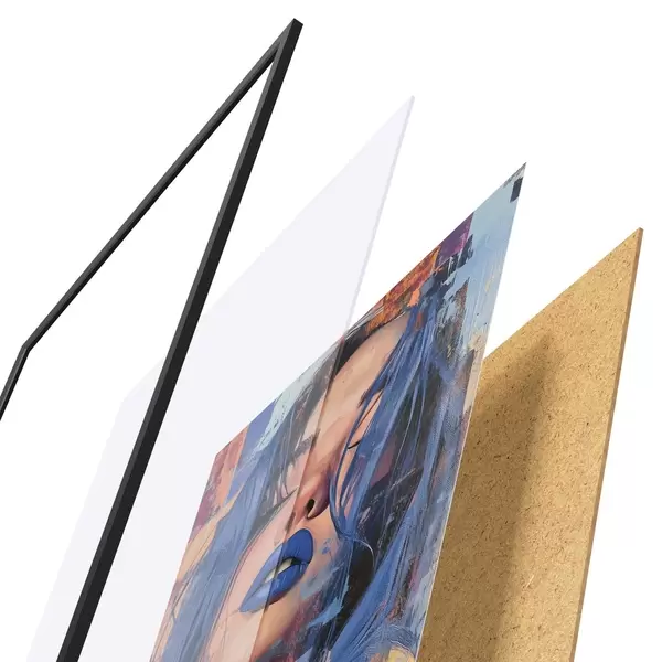 El póster consta de marco, plexiglás, imagen impresa y soporte de aglomerado. El póster puede colgarse inmediatamente en la pared gracias a los soportes de la parte posterior.