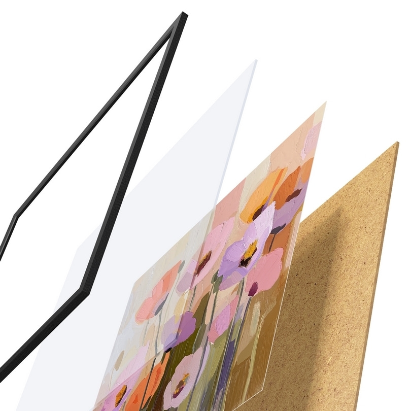 El póster consta de marco, plexiglás, imagen impresa y soporte de aglomerado. El póster puede colgarse inmediatamente en la pared gracias a los soportes de la parte posterior.
