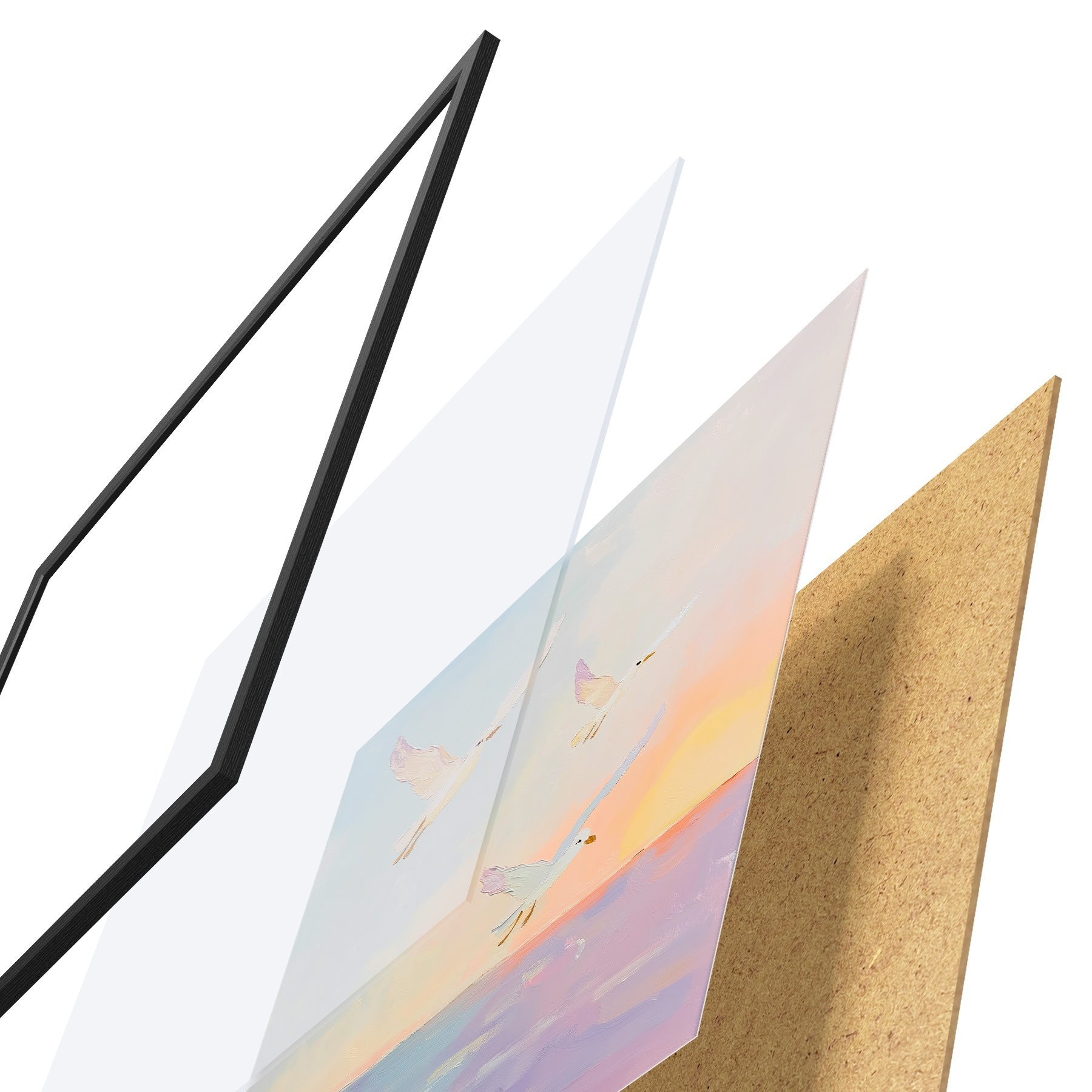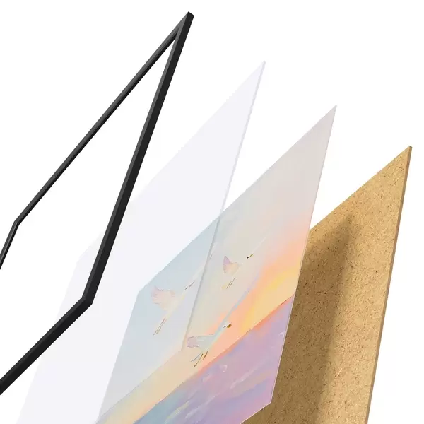 El póster consta de marco, plexiglás, imagen impresa y soporte de aglomerado. El póster puede colgarse inmediatamente en la pared gracias a los soportes de la parte posterior.