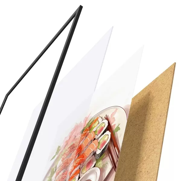El póster consta de marco, plexiglás, imagen impresa y soporte de aglomerado. El póster puede colgarse inmediatamente en la pared gracias a los soportes de la parte posterior.