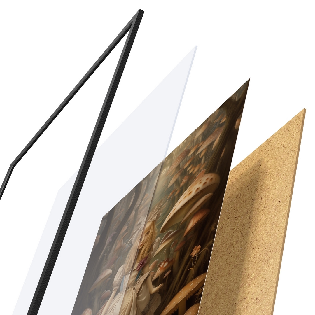 El póster consta de marco, plexiglás, imagen impresa y soporte de aglomerado. El póster puede colgarse inmediatamente en la pared gracias a los soportes de la parte posterior.
