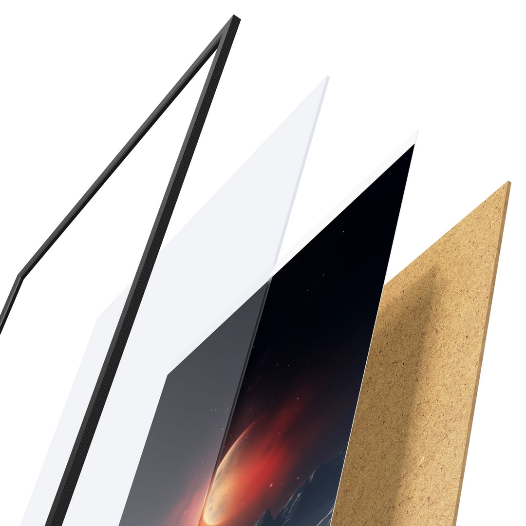 El póster consta de marco, plexiglás, imagen impresa y soporte de aglomerado. El póster puede colgarse inmediatamente en la pared gracias a los soportes de la parte posterior.