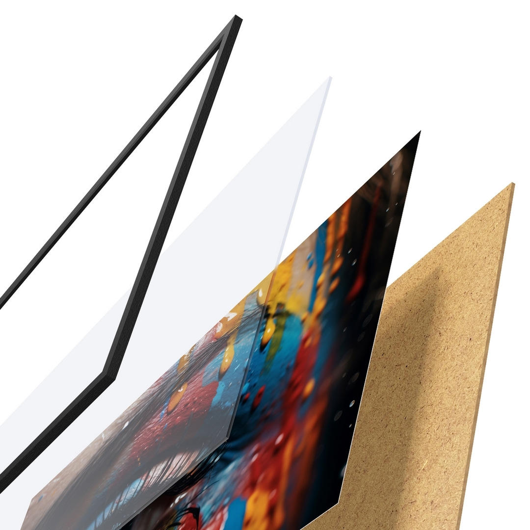El póster consta de marco, plexiglás, imagen impresa y soporte de aglomerado. El póster puede colgarse inmediatamente en la pared gracias a los soportes de la parte posterior.