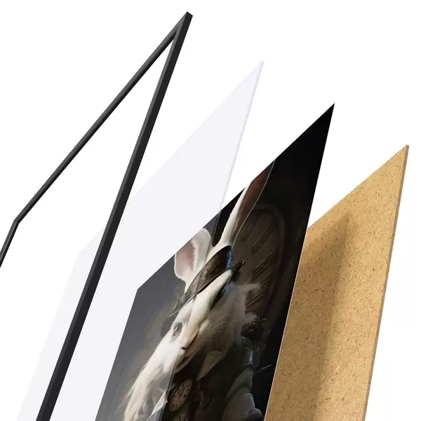 El póster consta de marco, plexiglás, imagen impresa y soporte de aglomerado. El póster puede colgarse inmediatamente en la pared gracias a los soportes de la parte posterior.