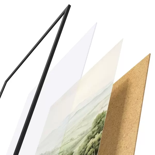 El póster consta de marco, plexiglás, imagen impresa y soporte de aglomerado. El póster puede colgarse inmediatamente en la pared gracias a los soportes de la parte posterior.