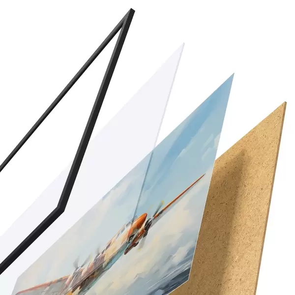El póster consta de marco, plexiglás, imagen impresa y soporte de aglomerado. El póster puede colgarse inmediatamente en la pared gracias a los soportes de la parte posterior.